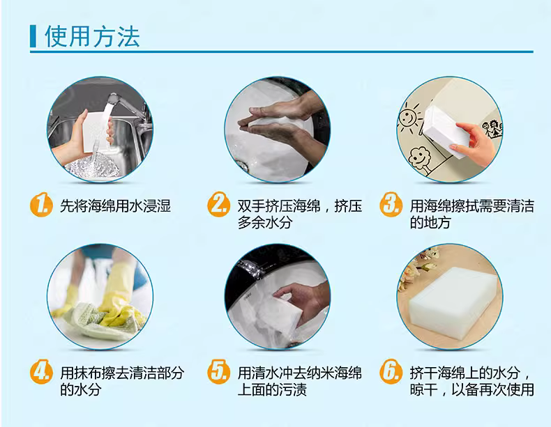 注意事項:對于皮革類產品,納米海綿使用在真皮上效果明顯,人造革稍次。由于納米海綿的吸附能力非常強,容易掉色或者染色過的皮革類產品先在不起眼的地方試擦一下,效果可以則大面積使用。